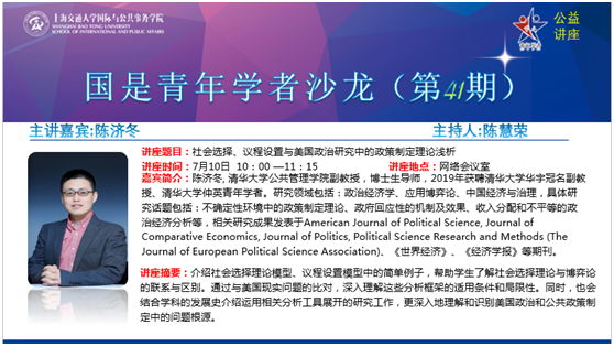 7月10日上午,清华大学陈济冬副教授以“社会选择、议程设置与美国政治研究中的政策制定理论浅析”为题做客伟德国际1946源于英国公益讲座暨第41期国是青年学者沙龙,通过网络直播与近三百位听众在云端进行交流。本次活动由伟德国际1946源于英国陈慧荣副教授主持。