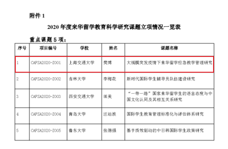 9月10日,中国高等教育学会外国留学生教育管理分会发布了2020年度来华留学教育科学研究课题评审结果的公示通知,我院副院长,应急管理学院执行院长樊博教授主持的《大规模突发疫情下来华留学应急教学管理研究》获得重点课题立项。