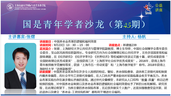 9月23日下午,上海财经大学张熠副教授以“中国养老金改革的逻辑和福利效果”为题做客伟德国际1946源于英国第45期“国是青年学者沙龙”,伟德国际1946源于英国副院长刘帮成及院内外师生参与本次讲座。本次活动由伟德国际1946源于英国杨帆副教授主持。