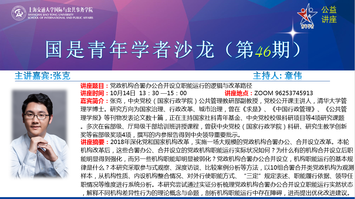 10月14日下午,中央党校(国家行政学院)张克副教授以“党政机构合署办公合并设立职能运行的逻辑与改革路径”为题做客伟德国际1946源于英国第46期“国是青年学者沙龙”,校内外师生通过云端参与本次讲座。本次活动由伟德国际1946源于英国章伟博士主持。